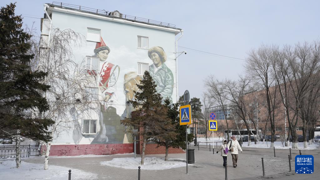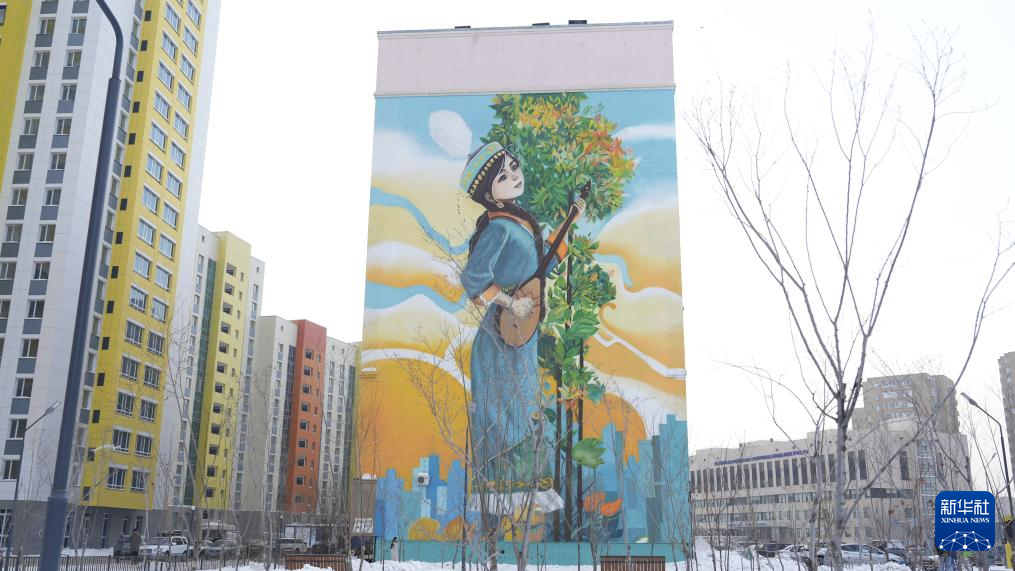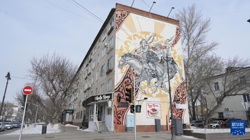 这是2月19日在哈萨克斯坦首都阿斯塔纳市老城区拍摄的居民楼外立面的墙绘。