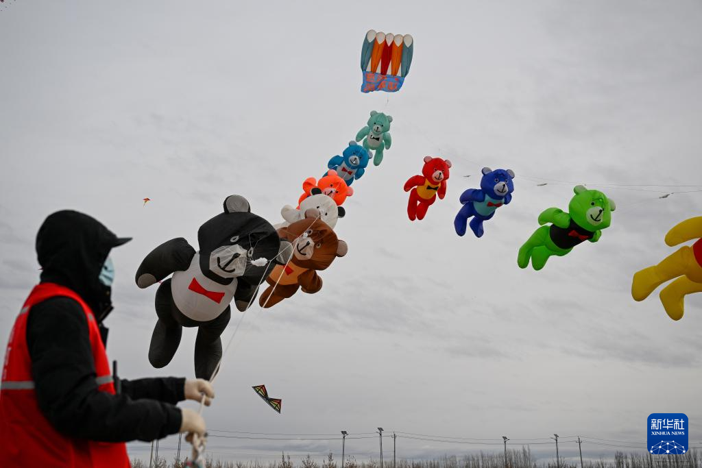 这是3月8日在新疆都拉塔口岸房车露营基地拍摄的风筝表演。