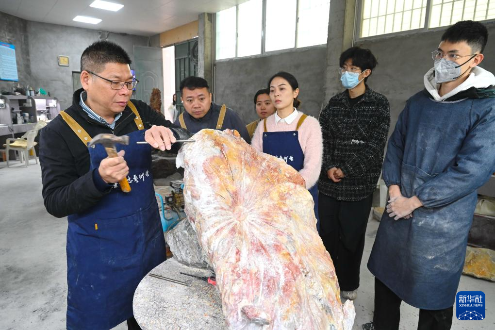 在福建省工艺美术大楼寿山石雕刻工作室,中国工艺美术大师郑则评(左)在指导学生进行寿山石雕刻创作(3月6日摄)。