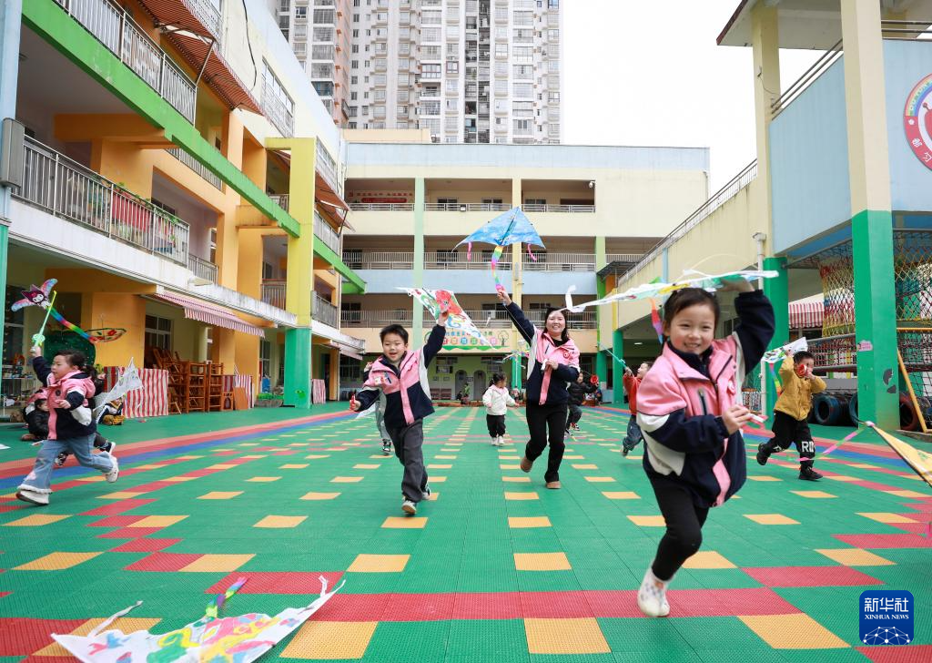 3月20日,贵州省黔南布依族苗族自治州都匀市第六幼儿园的老师和小朋友在放风筝。