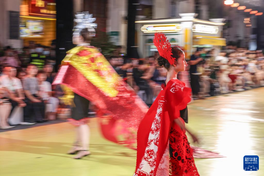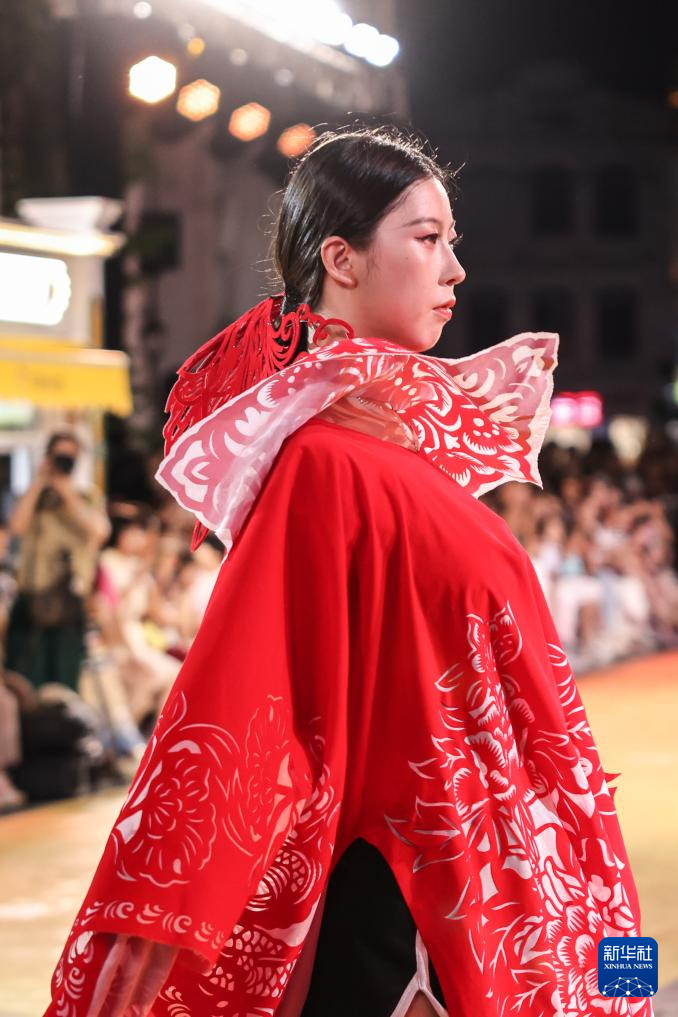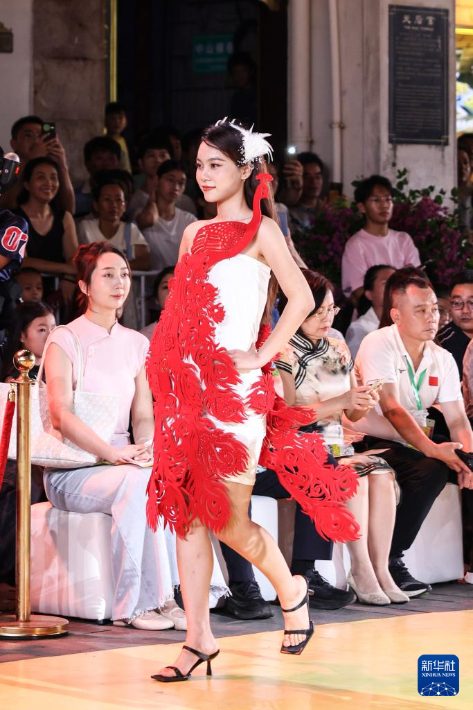 10月7日晚,作为2025海口艺术周系列活动之一,锦色·2025非遗潮秀在海口骑楼老街启幕。活动以“非遗再创”为核心,将剪纸艺术元素融入时装走秀。