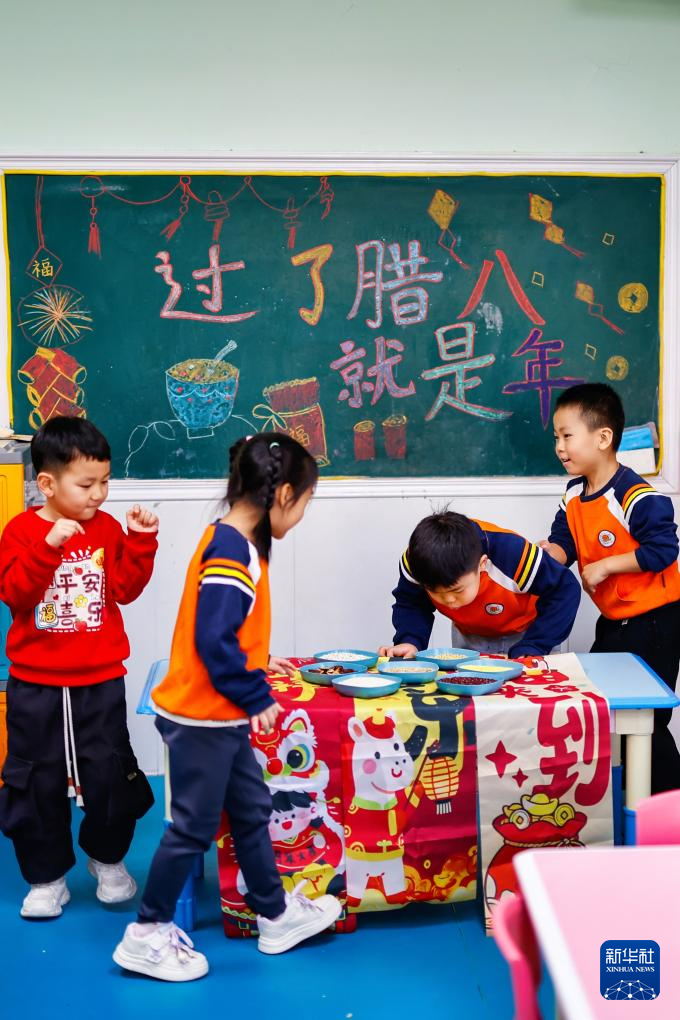 1月26日,在河北省石家庄市正定县幼儿园,小朋友们准备腊八粥食材。