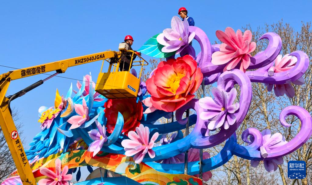 2月2日,在洛阳隋唐遗址植物园,工作人员在安装花灯。