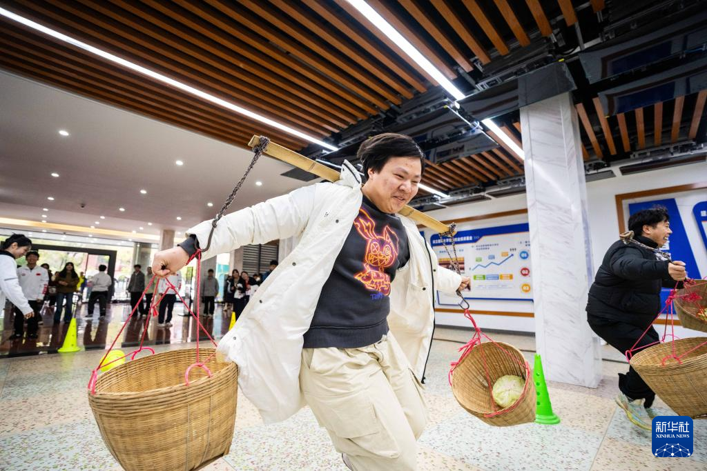 3月19日,学生在湖南农业大学参加农趣运动游戏——竞速搬运。