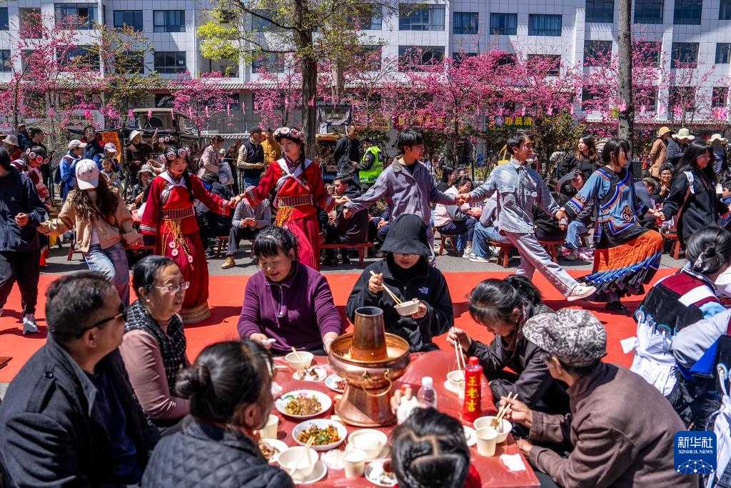 3月26日,人们在丽江市雪山路长街宴活动现场品尝美食。