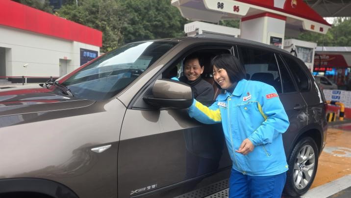 图为中国石油重庆销售公司南坪综合能源站副经理王亚芬正在为客户擦拭反光镜。