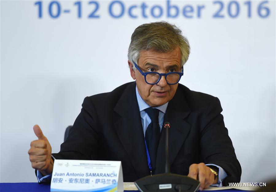 IOC Vice-President Juan Antonio Samaranch Salisachs speaks during the press conference for the 1st Meeting of the IOC Coordination Commission for the XXIV Olympic Winter Games Beijing 2022 in Beijing, capital of China, Oct. 12, 2016. (Xinhua/Ju Huanzong)
