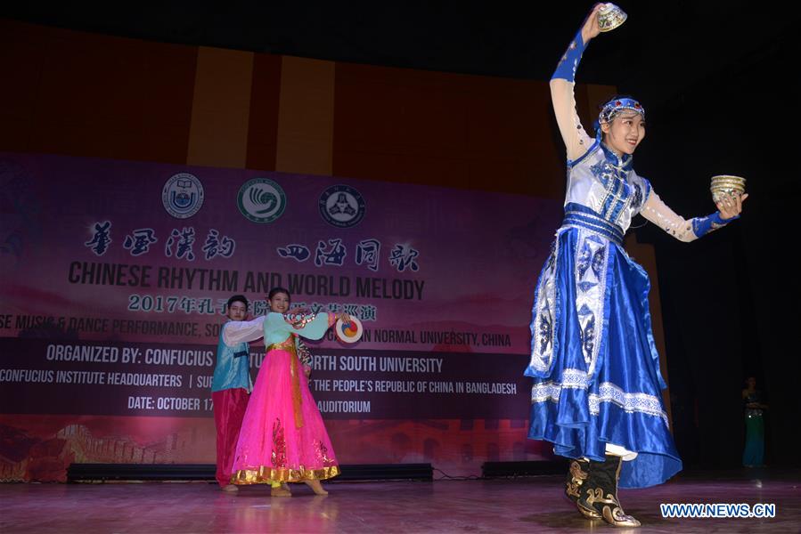 Dancers perform during a gala event of Chinese dance and music performance in Dhaka, capital of Bangladesh, on Oct. 17, 2017. (Xinhua/Salim Reza)