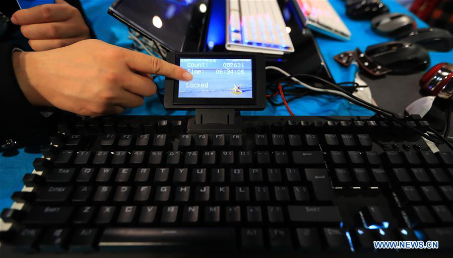 A staff member shows a keyboard with a screen, which is produced by Chinese company Suoai at Consumer Electronics Show (CES) in Las Vegas, the United States, Jan. 10, 2018. (Xinhua/Li Ying)