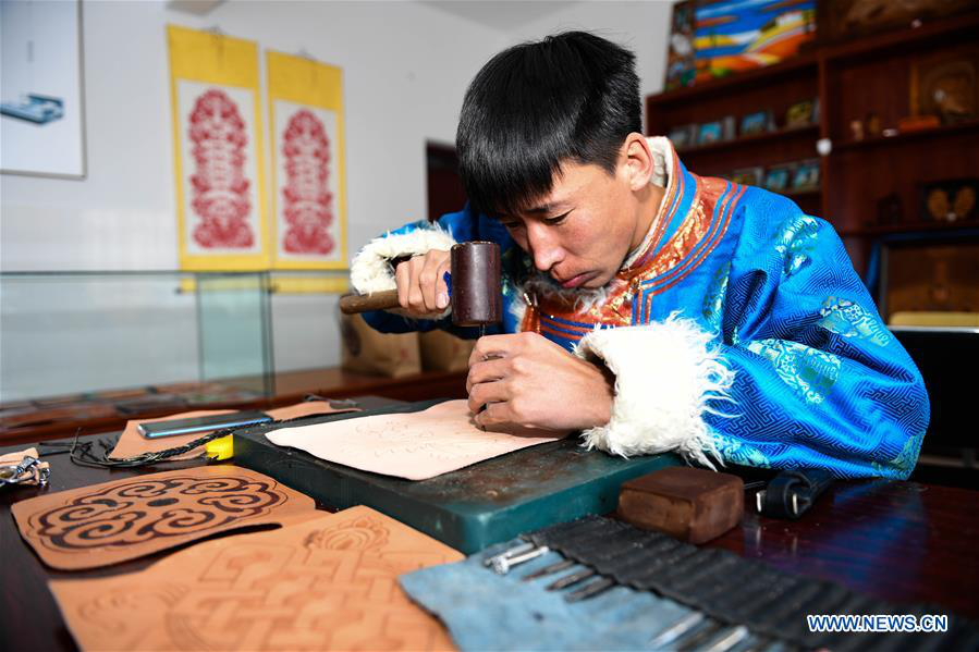A learner of Mongolian ethnic group learns to make leather carving at a business incubator base in Hexigten Qi, north China's Inner Mongolia Autonomous Region, Jan. 10, 2018. Local government of Hexigten Qi has provided free training on traditional handicraft to the unemployed, graduates and impoverished family since 2017. (Xinhua/Deng Hua)