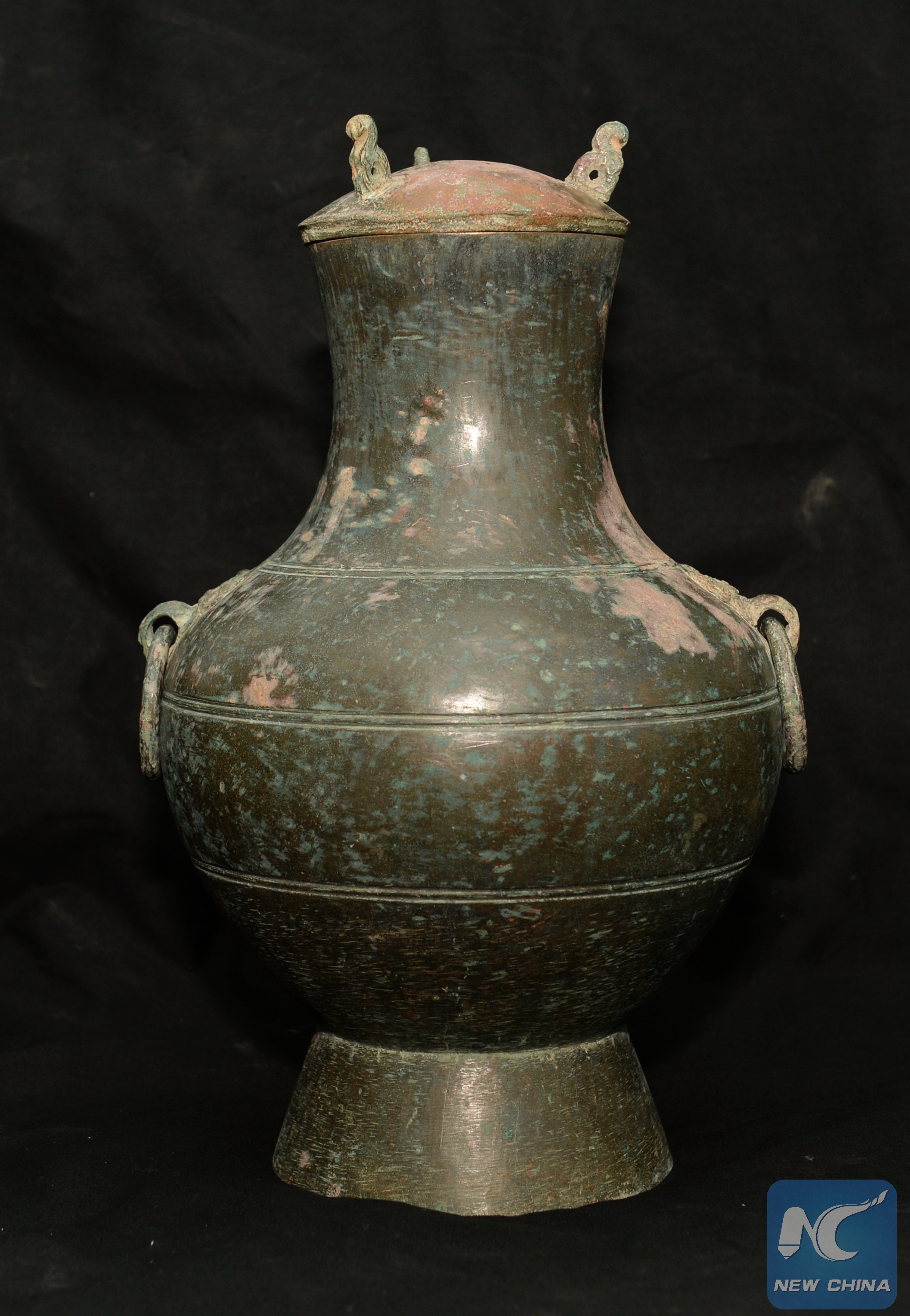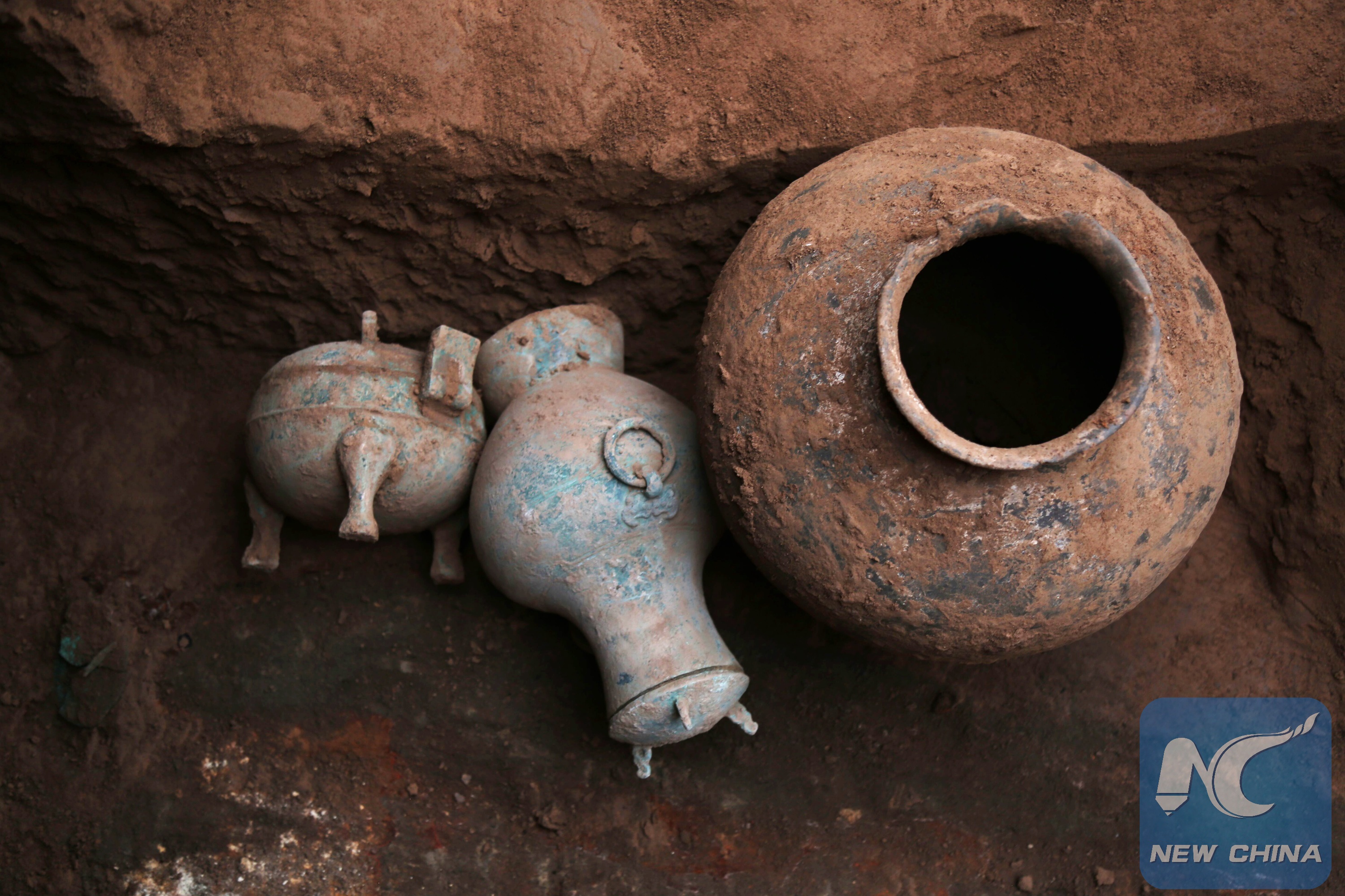 A bronze kettle containing liquor (middle) was unearthed from a Qin Dynasty tomb in northwest China's Shaanxi Province on March 18, 2018. (XINHUA/Li Yibo)