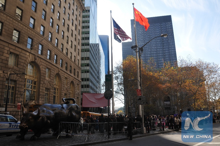 Chinese national flag rises at Wall Street in New York, U.S. , Nov. 16, 2009. (Xinhua/Wang Jiangang)
