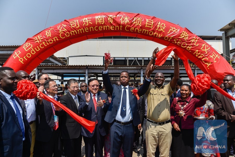 Zambian President Edgar Lungu (C) cuts the ribbon during the Production Commencement Ceremony of the South East Ore Body (SEOB), Nonferrous China Africa (NFCA) in Zambia's Chambishi town on Aug. 22, 2018.(Xinhua/Vincent Chen)