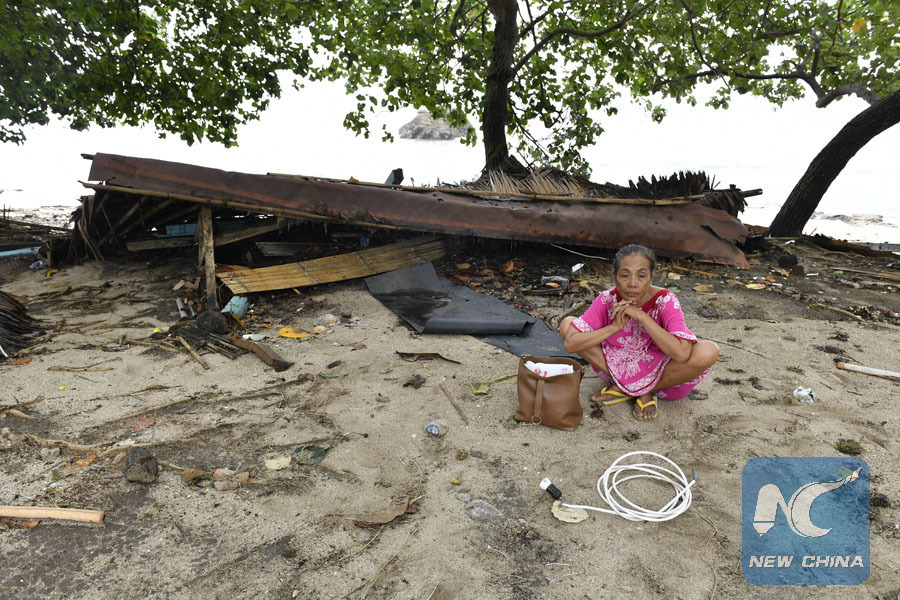 A woman sits by the debris of her kiosk near the beach in Carita after a tsunami hit Sunda Strait in Pandeglang, Banten province, in Indonesia, Dec. 23, 2018. (Xinhua/Wahyu Wening)