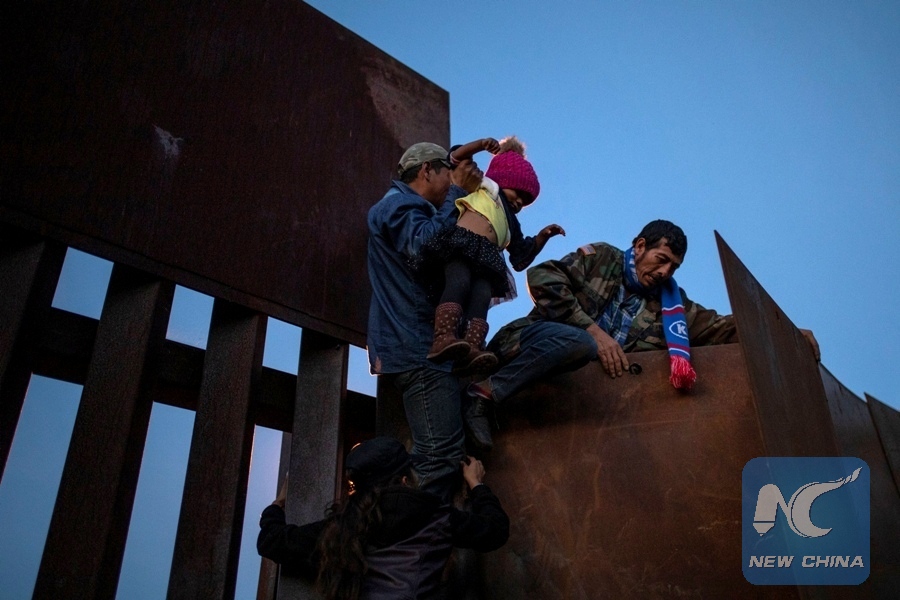 A migrant from Honduras, part of a caravan of thousands from Central America trying to reach the United States, holds a young girl as others jump over the border wall to enter the United States illegally from Tijuana, Mexico, Dec. 2, 2018. (REUTERS Photo)