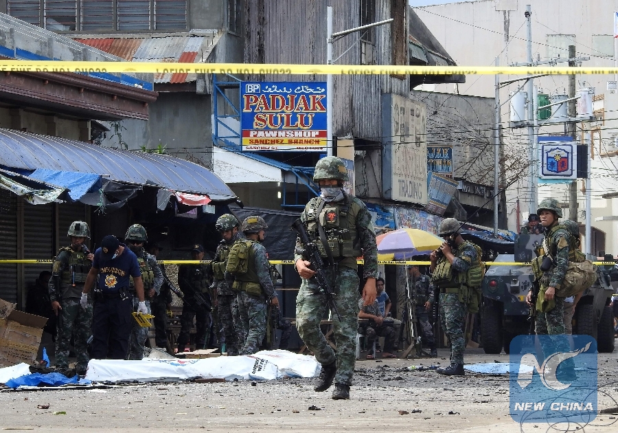 Policemen and soldiers keep watch as body bags (in white), containing the remains of blast victims, as seen in a cordoned area outside a church in Jolo, Sulu province on the southern island of Mindanao, on Jan. 27, 2019. (Xinhua/AFP)