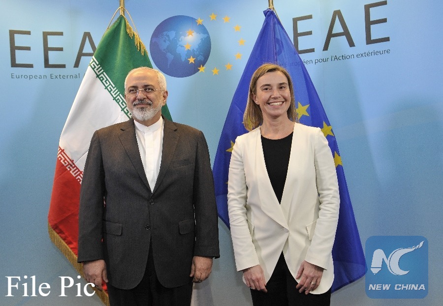 EU High Representative for Foreign Affairs and Security Policy Federica Mogherini (R) meets with Iran's Foreign Minister Mohammad Javad Zarif in Brussels, Beglium, on March 16, 2015. (Xinhua File photo)