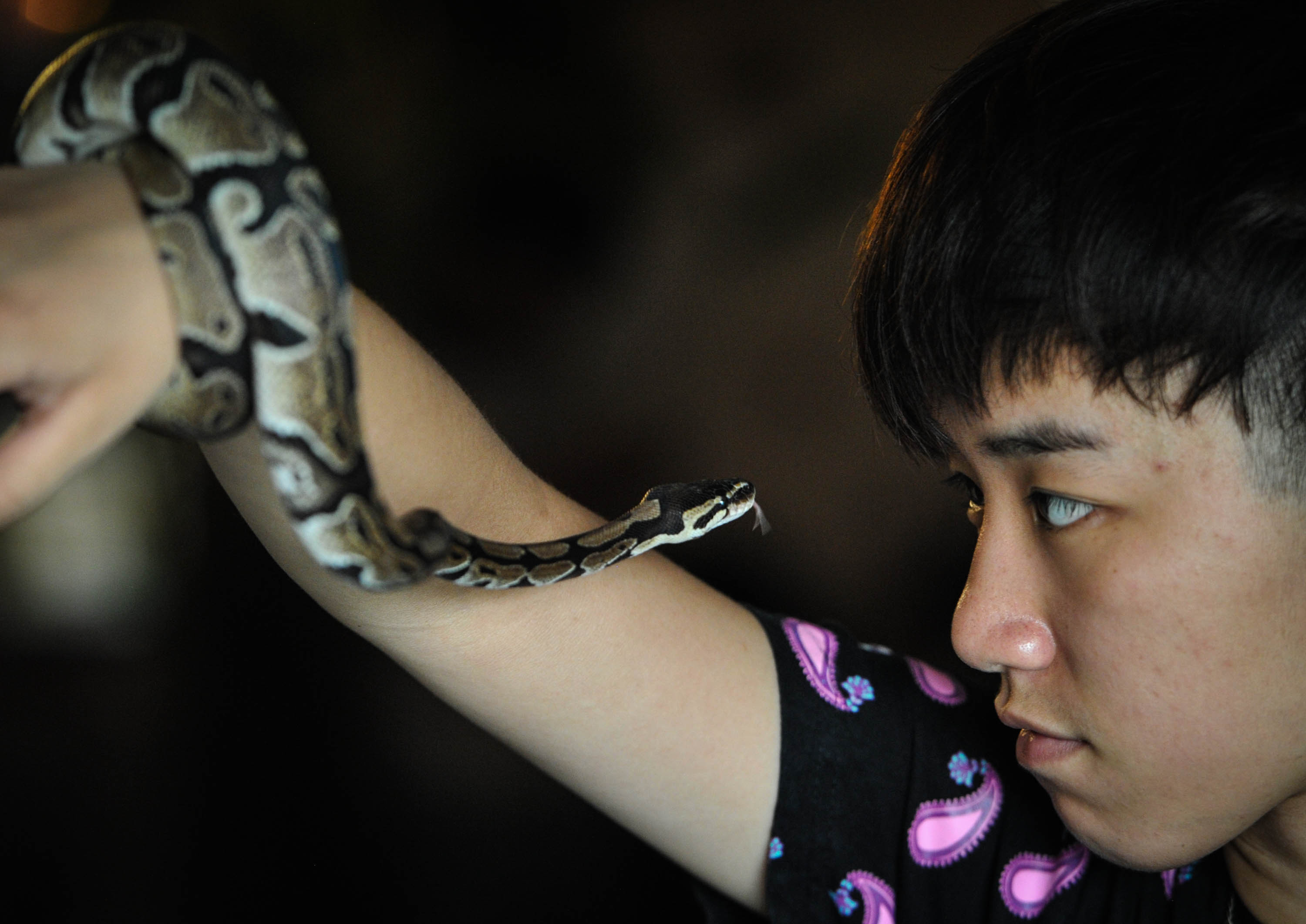Photo taken on July 30, 2014 shows an employee at a pet shop plays with a snake in Xi'an, NW China's Shaanxi Province. (Xinhua/Ding Haitao)