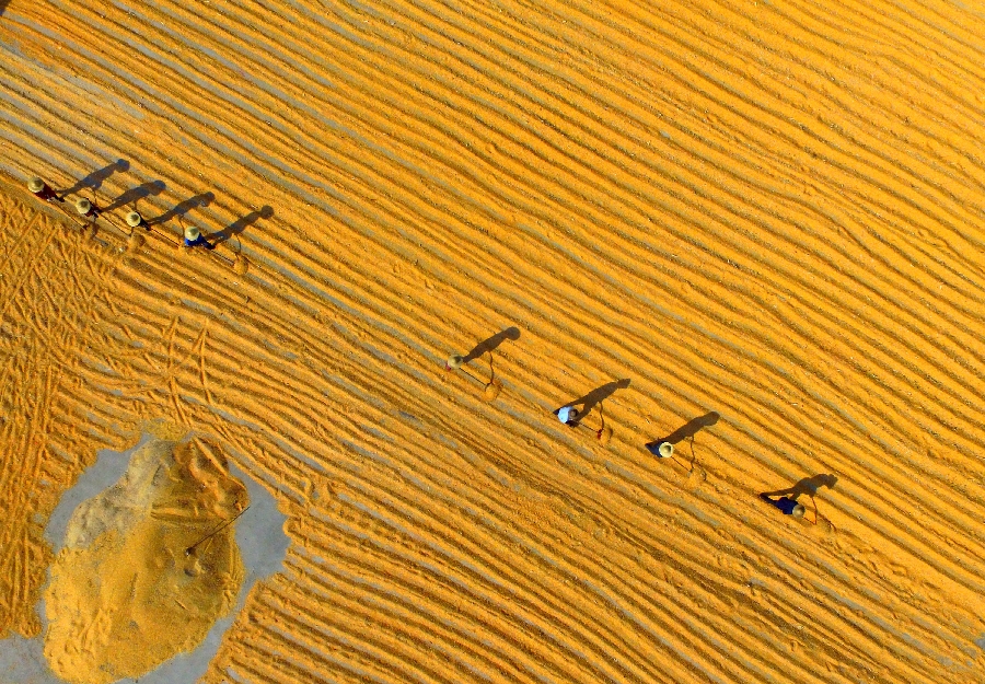 Aerial photo taken on Oct. 11, 2018 shows farmers airing newly-harvested corn grains in Pingyi County of Linyi, east China's Shandong Province. (Xinhua)
