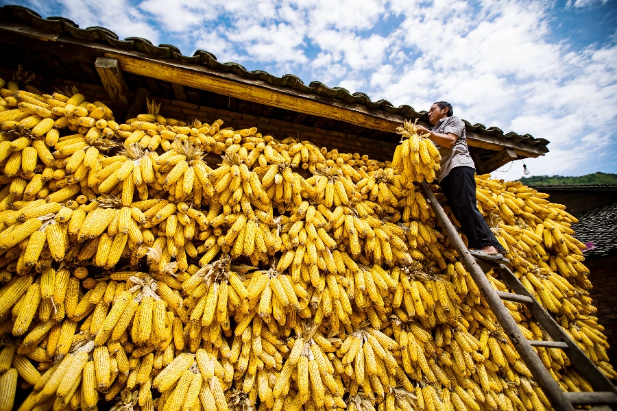 A villager hangs corn ears for air-drying in Jiaolong Village of Majiadu Township in Zhushan County, Shiyan, central China's Hubei Province, Sept. 22, 2018. (Xinhua)