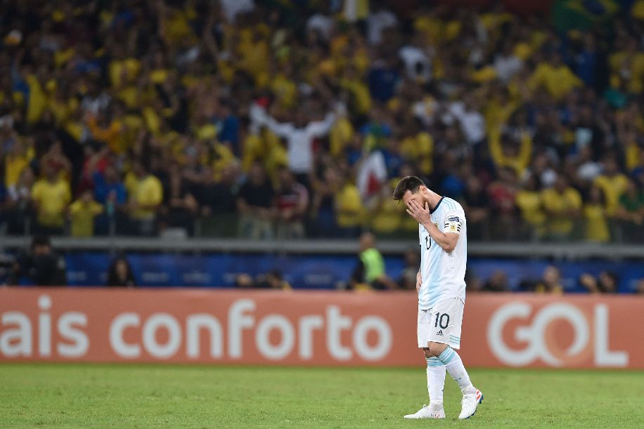 Argentina's Lionel Messi (L) gestures after losing 2-0 to Brazil at the end of their Copa America football tournament semi-final match at the Mineirao Stadium in Belo Horizonte, Brazil, on July 2, 2019. (Photo by Pedro Ugarte / AFP)