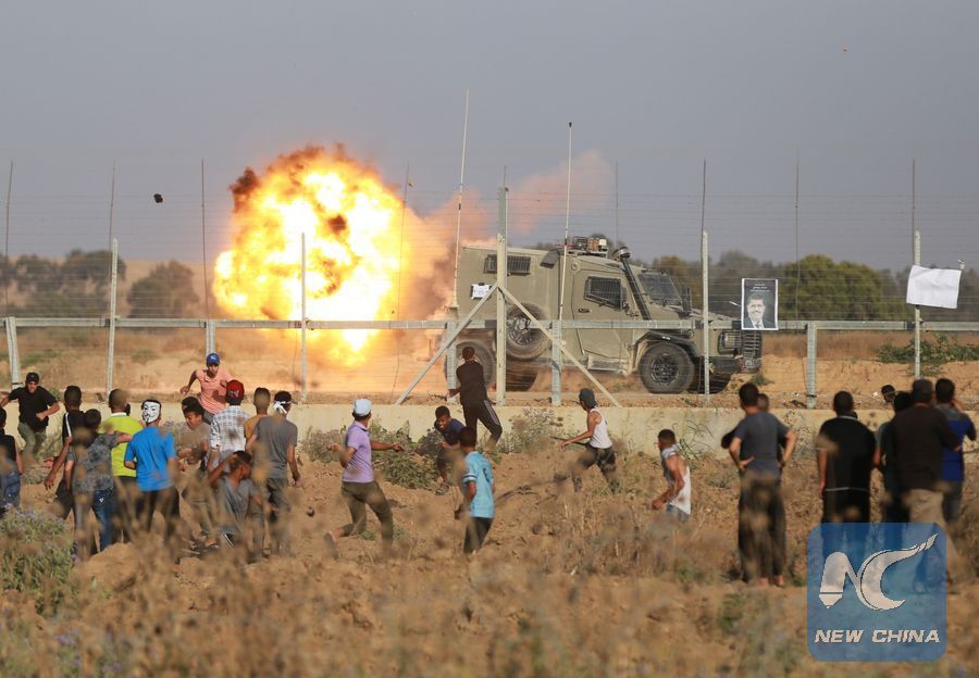 Palestinian protesters clash with Israeli troops on the Gaza-Israel border, east of al-Bureij refugee camp in central Gaza Strip, on June 21, 2019 and at least 81 Palestinians were injured during the clashes. (Xinhua/Yasser Qudih)