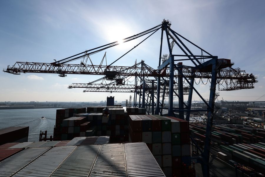 Photo taken on Feb. 23, 2018 shows a view of the port area of Hamburg, Germany. (Xinhua/Shan Yuqi)