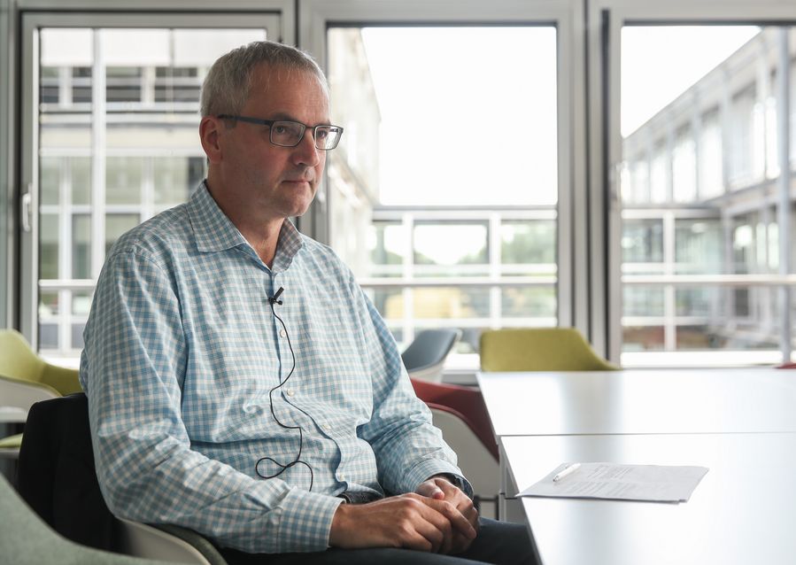 Thiess Petersen, senior adviser at the German Bertelsmann Foundation, receives an interview with Xinhua at the Bertelsmann Foundation in Guetersloh, western Germany, on Aug. 14, 2019. (Xinhua/Shan Yuqi)