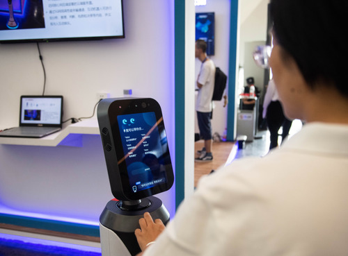 A visitor interacts with an intelligent robot at a product exhibition during the 2019 World Computer Congress in Changsha, central China's Hunan Province, on Sept. 10, 2019. (Xinhua/Chen Sihan)