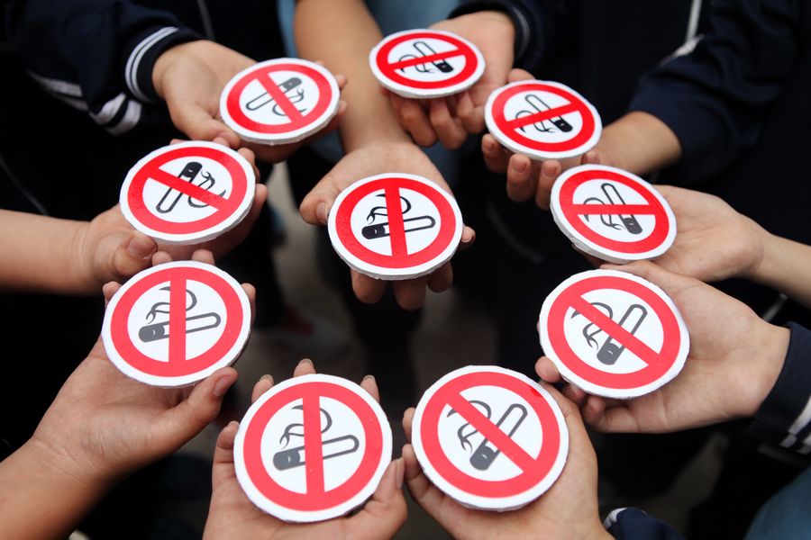 Middle school students hold cigarette models with no smoking signs during a World No Tobacco Day activity in Handan, north China's Hebei Province, May 29, 2015. (Xinhua/Mou Yu)