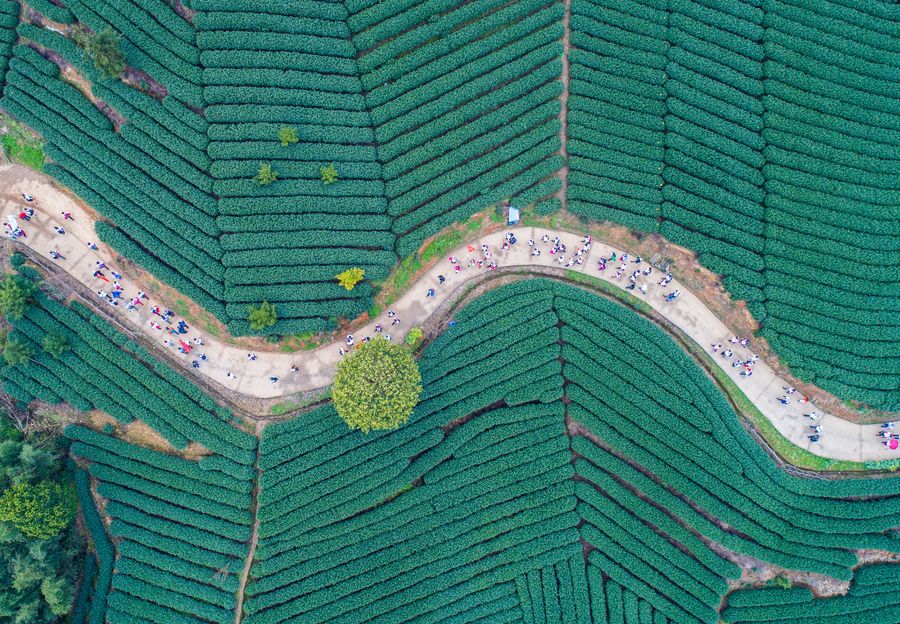 Aerial photo taken on March 26, 2018 shows tourists visiting a tea plantation in Fuyang District of Hangzhou, capital of Zhejiang Province. (Xinhua/Xu Yu)