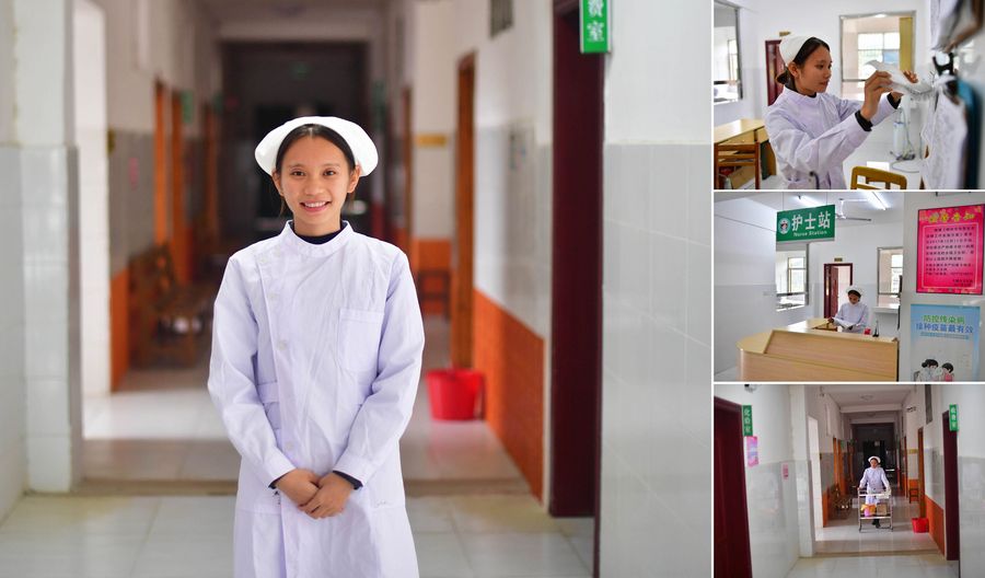Combo photo shows 19-year-old nurse Liao Tiantian posing for a picture (main image in the layout); and Liao performing her duties (smaller images in the right-side column), at a rural hospital in Dapo Township, Rong'an County, south China's Guangxi Zhuang Autonomous Region, Oct. 23, 2019. Liao began to work as a rural hospital nurse after she completed her medical trainings in August 2019. (Xinhua/Huang Xiaobang)