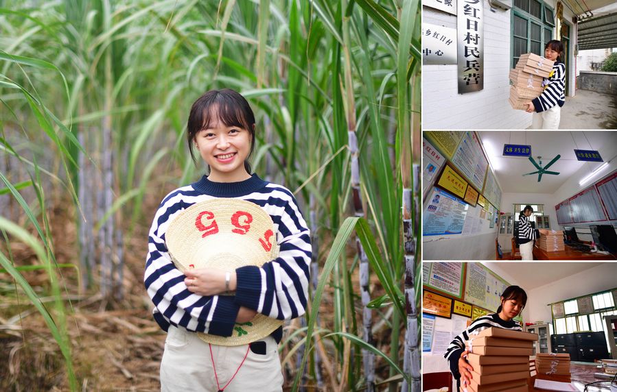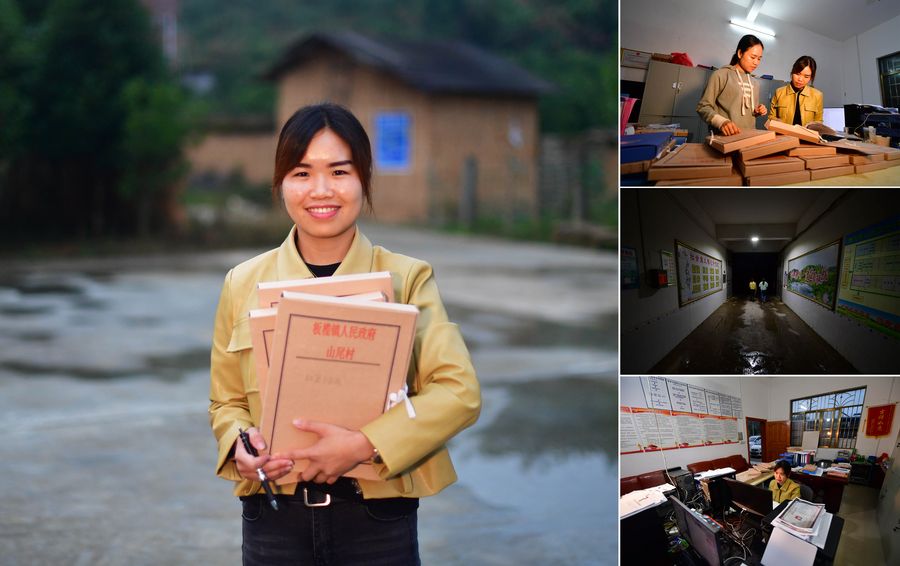 Combo photo shows 27-year-old Wei Yuqi, deputy mayor of Banlan Township, posing for a picture (main image in the layout); and Wei performing her duties (smaller images in the right-side column), in Banlan Township, Rong'an County, south China's Guangxi Zhuang Autonomous Region, Oct. 22, 2019. An experienced poverty alleviation worker, Wei took office as deputy mayor of Banlan Township in March 2019. (Xinhua/Huang Xiaobang)