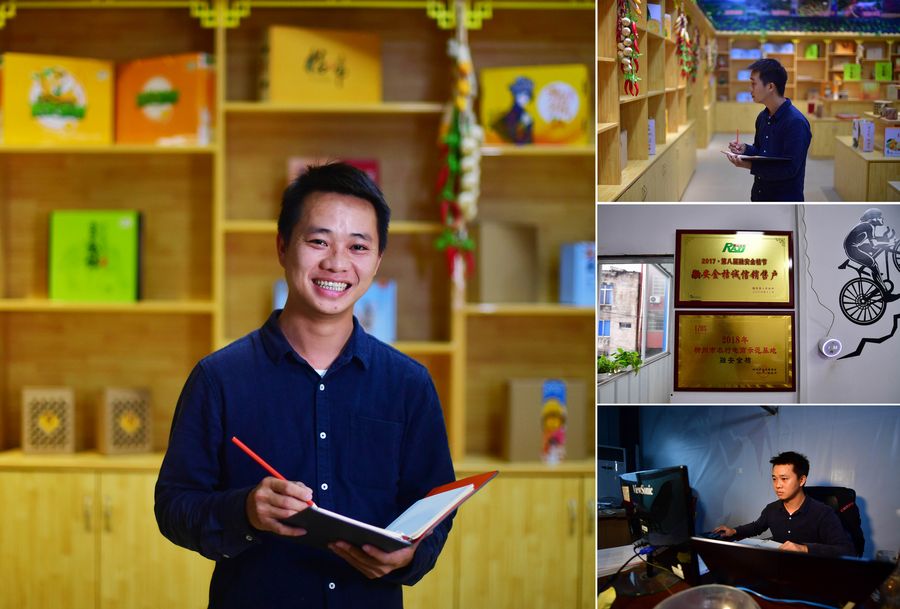 Combo photo shows 29-year-old Chen Tian'an posing in the agricultural development company he runs (main image in the layout); and on-site scenes in Chen's company (smaller images in the right-side column) in Rong'an County, south China's Guangxi Zhuang Autonomous Region, Oct. 22, 2019. Both of Chen's parents suffer from physical disability and the family used to live under financial pressure. In 2016, Chen and a few classmates started their own e-commerce business selling local specialties such as kumquats. (Xinhua/Huang Xiaobang)