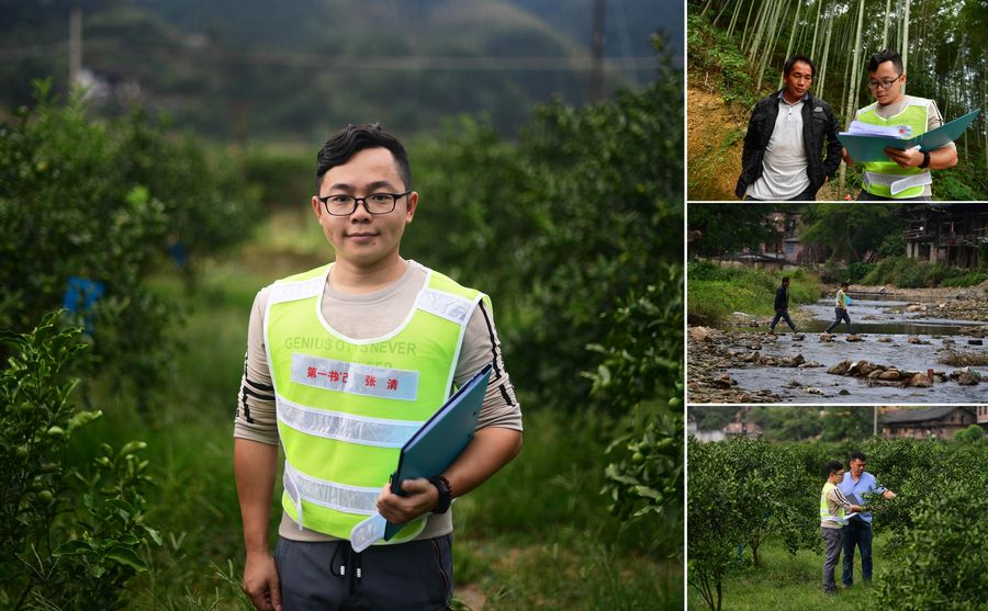 Combo photo shows 27-year-old Zhang Qing posing for a picture in Si'an Village, where he works as the Party chief (main image in the layout); and Zhang performing his duties in Si'an Village (smaller images in the right-side column), in Banlan Township of Rong'an County, south China's Guangxi Zhuang Autonomous Region, Oct. 20, 2019. It's been more than a year since Zhang came to work in Si'an Village. He and his co-workers have helped 100 households in the village get rid of poverty by planting kumquats and cedar trees. (Xinhua/Huang Xiaobang)