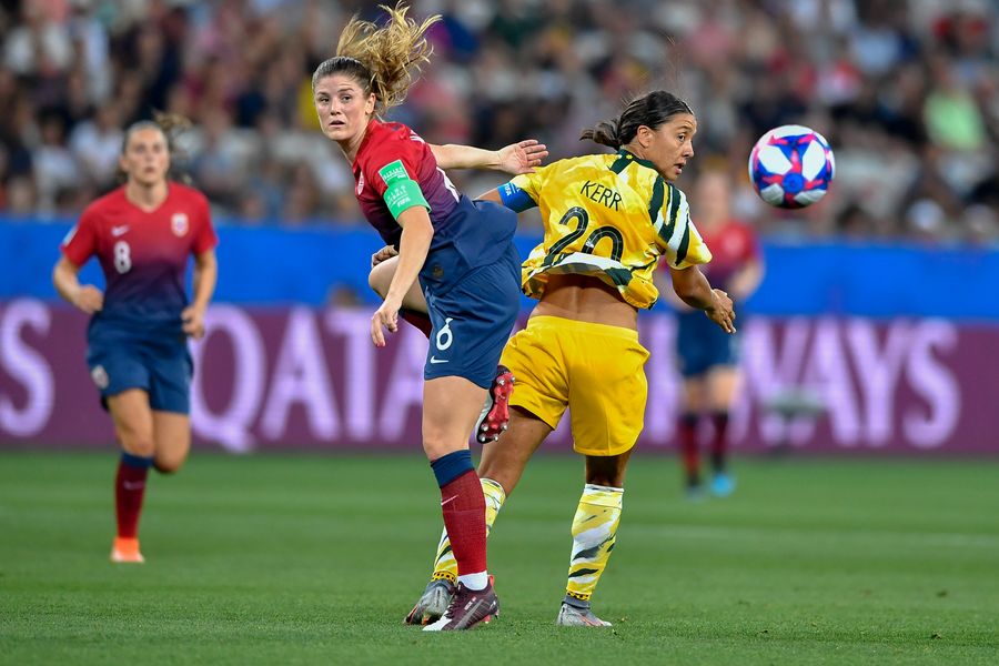 Maren Mjelde (L) of Norway vies with Sam Kerr (R) of Australia during the round of 16 match at the 2019 FIFA Women's World Cup in Nice, France on June 22, 2019. (Xinhua/Chen Yichen)