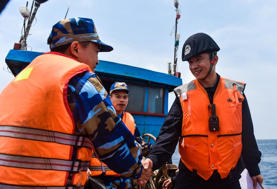 Maritime policemen from China and Vietnam shake hands before a joint fishery inspection in the Beibu Gulf, April 18, 2017. China and Vietnam started a joint fishery inspection in the Beibu Gulf. (Xinhua/Mao Siqian)