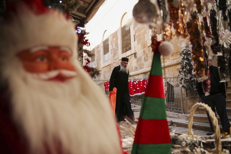 A man walks past Santa Claus outfits displayed for sale in Jerusalem's Old City on Dec. 18, 2019. (Photo by Muammar Awad/Xinhua)
