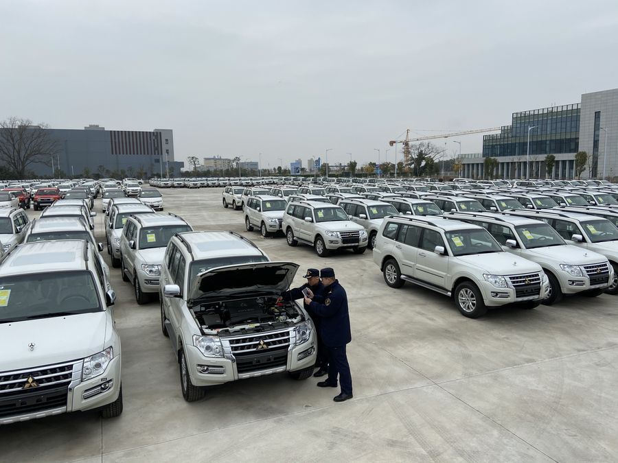Customs officers inspect imported vehicles at Chenglingji port in central China's Hunan Province on Dec. 20, 2019. (Provided to Xinhua)