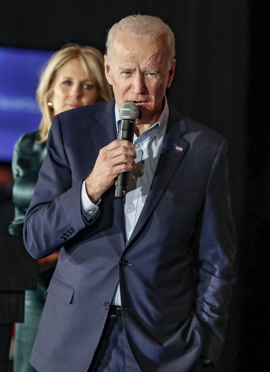 Democratic presidential candidate Joe Biden, former U.S. vice president, attends a caucus night rally with his wife Jill Biden at Drake University in Des Moines, Iowa, the United States, Feb. 3, 2020. (Photo by Joel Lerner/Xinhua)