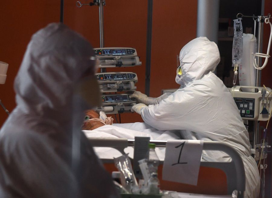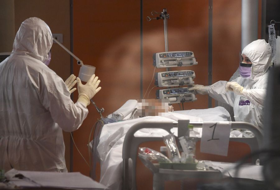 A medical worker treats a patient in the ICU of Istituto Clinico Casalpalocco, in Rome, Italy, March 25, 2020. (Photo by Alberto Lingria/Xinhua)