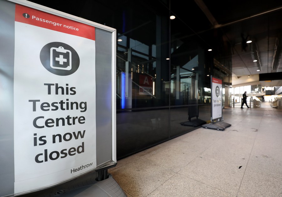 A closed testing centre is seen in Heathrow Airport in London, Britain, March 18, 2022. (Xinhua/Li Ying)