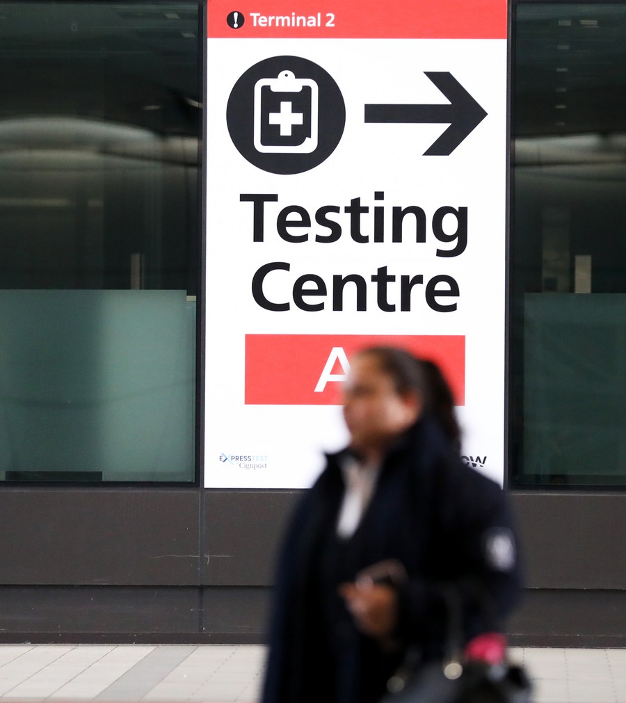 A woman walks past a sign indicating the testing centre in Heathrow Airport in London, Britain, March 18, 2022. (Xinhua/Li Ying)