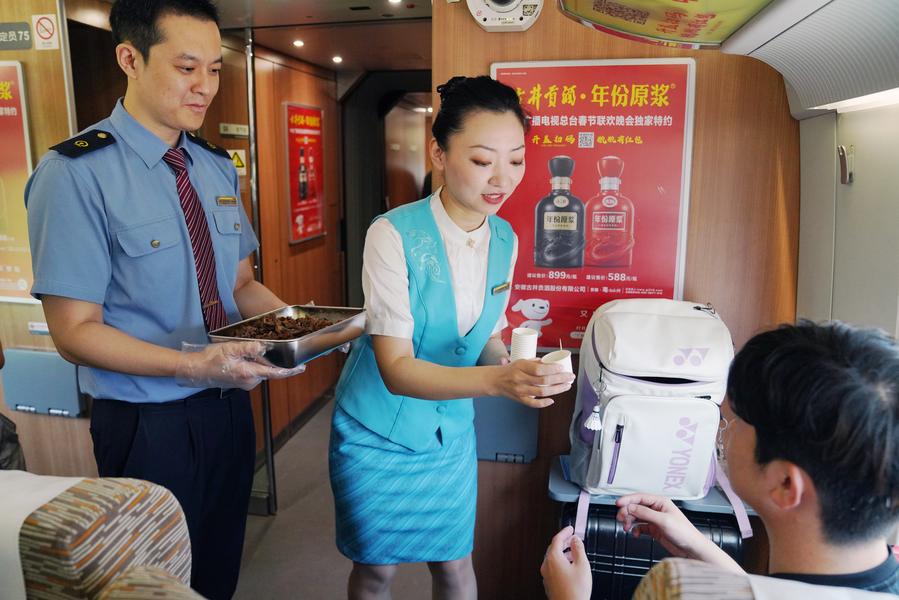 HARBIN, June 19 (Xinhua) -- A Qiqihar barbecue cultural experience event was held Wednesday on bullet train D6993 running from Harbin West Railway Station to Qiqihar South Railway Station in northeast China's Heilongjiang Province, offering a "palatable" travel experience to passengers during the journey.