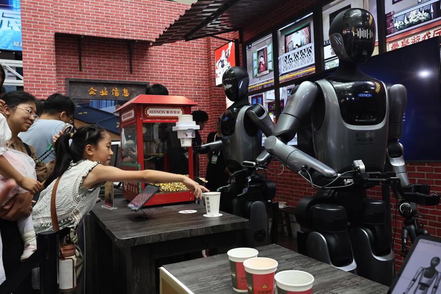 Visitors experience a ride in a next-generation intelligent cockpit system based on a large model by StepFun at the 2025 World AI Conference in east China's Shanghai, July 27, 2025. (Xinhua/Fang Zhe)China Mobile's self-developed robot dogs and humanoid robot dance at the company's booth during the 2025 World AI Conference in east China's Shanghai, July 27, 2025. (Xinhua/Chen Haoming)Humanoid robots serve popcorn and beverage at the 2025 World AI Conference in east China's Shanghai, July 27, 2025. (Xinhua/Fang Zhe)A visitor takes photos of a product at the booth of XtalPi during the 2025 World AI Conference in east China's Shanghai, July 27, 2025. (Xinhua/Chen Haoming)People visit a display of smart glasses at the 2025 World AI Conference in east China's Shanghai, July 27, 2025. (Xinhua/Fang Zhe)Visitors try the WPS Office AI system at the 2025 World AI Conference in east China's Shanghai, July 27, 2025. (Xinhua/Fang Zhe)A staff member of Tencent (L) introduces Tairos, an modular embodied intelligence open platform, to visitors at the 2025 World AI Conference in east China's Shanghai, July 27, 2025. (Xinhua/Chen Haoming)Visitors learn about a humanoid robot at the 2025 World AI Conference in east China's Shanghai, July 27, 2025. (Xinhua/Chen Haoming)A staff member (R) of Westwell, a Chinese technology company, introduces a Q-Tractor P40 Plus new energy unmanned vehicle to a visitor during its debut at the 2025 World AI Conference in east China's Shanghai, July 27, 2025. (Xinhua/Chen Haoming)