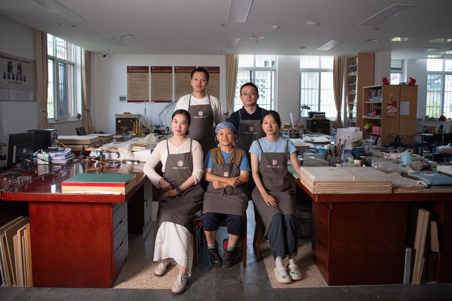 Book restorers Jiang Yun (L) and Zhang Wenwen discuss during restoration work at Anhui Provincial Library in Hefei, east China's Anhui Province, May 8, 2025.(Xinhua/Zhang Duan)Book restorers Geng Ning, Zhou Yahan, Zhang Wenwen (front, from L to R), Jin Xin and Zang Chunhua (rear, from L to R) pose for a group photo at Anhui Provincial Library in Hefei, east China's Anhui Province, June 17, 2025. (Xinhua/Zhang Duan)■