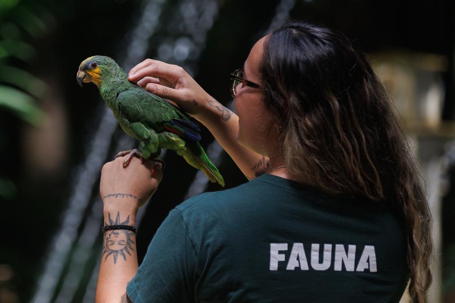 A staff member interacts with a yellow-crowned Amazon parrot at a park in Belem, Brazil, Nov. 13, 2025. (Photo by Claudia Martini/Xinhua)
