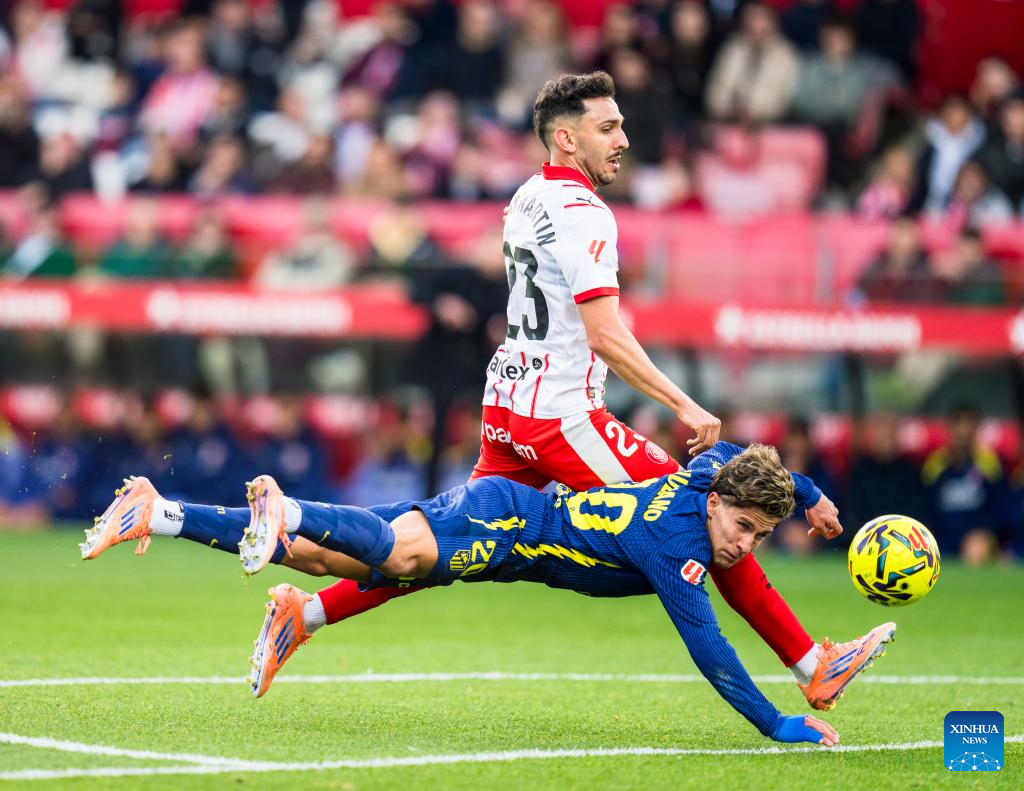Giuliano Simeone (bottom) of Atletico de Madrid vies with Ivan Martin of Girona FC during the La Liga football match between Girona FC and Atletico de Madrid in Montilivi Stadium, Girona, Spain, on Dec. 21, 2025. (Photo by Joan Gosa/Xinhua)