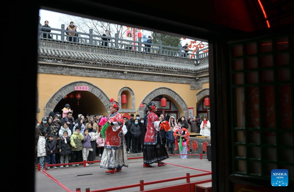 Tourists watch a folk performance at a traditional Dikengyuan residence in Beiying Village, Zhangbian Township, Shanzhou District, Sanmenxia City of central China's Henan Province, Dec. 21, 2025.