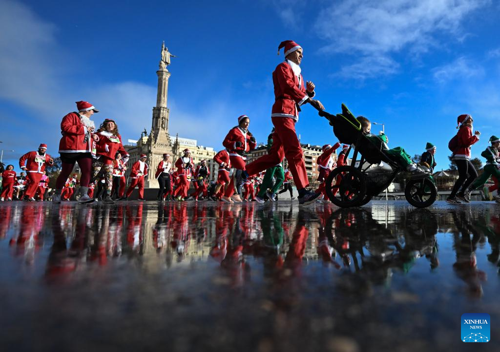 Runners in Santa Claus costumes attend a Christmas-themed running event in Madrid, Spain, Dec. 21, 2025. (Xinhua/Cheng Min)